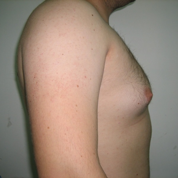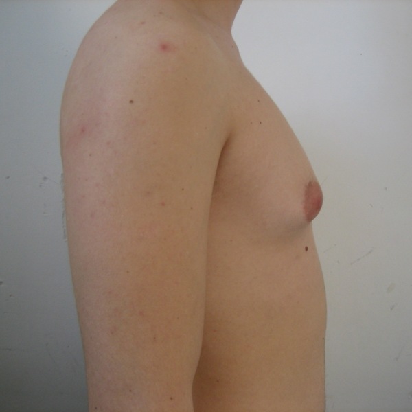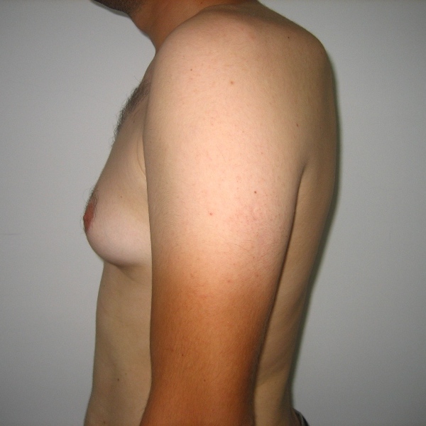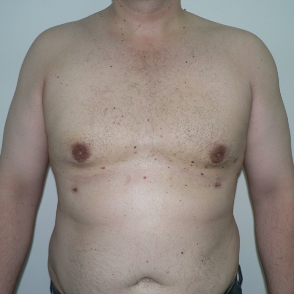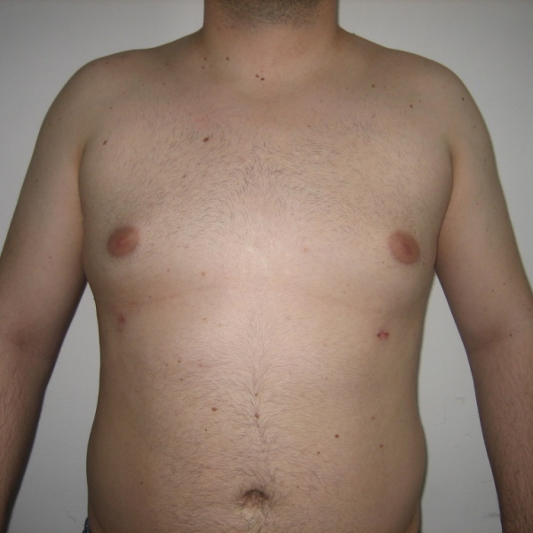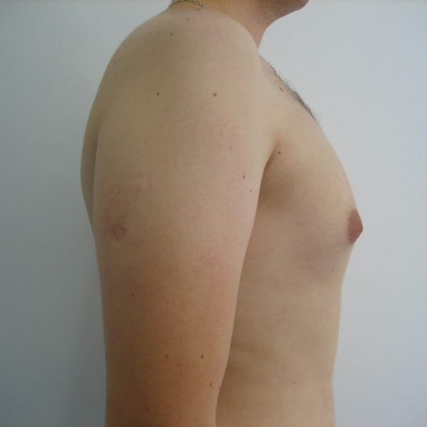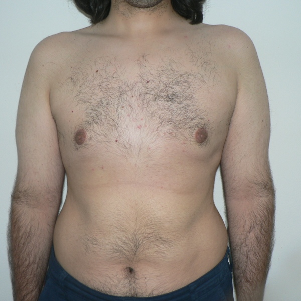 Ginecomastie bilaterala tratata cu lipoaspiratie si excizie glandulara, rezultat la 1 an postoperator. |