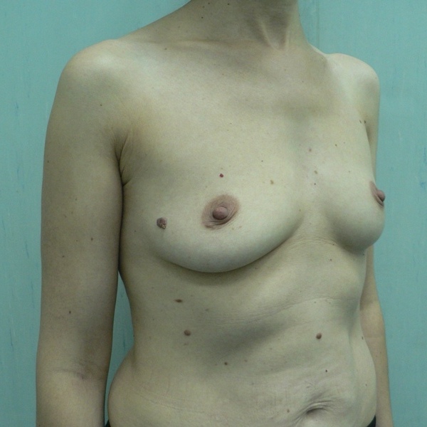Pacienta, 23 ani, augmentare mamara cu implante Mentor 325 cc rotunde profil moderat plus, introduse subpectoral prin abord inframamar. Rezultat la 4 luni postoperator. |