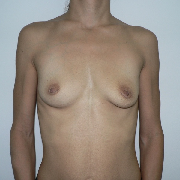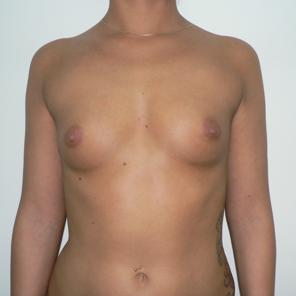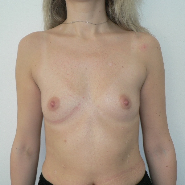 Pacienta, 24 ani, augmentare mamara cu implante Arion rotunde 400 cc profil moderat introduse subpectoral prin abord inframamar, rezultat la 2 saptamani postoperator. |