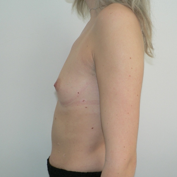 Pacienta, 23 ani, augmentare mamara cu implante Mentor rotunde moderat plus 300cc introduse subpectoral prin abord inframamar. Rezultat la 2 ani si jumatate postoperator. |
