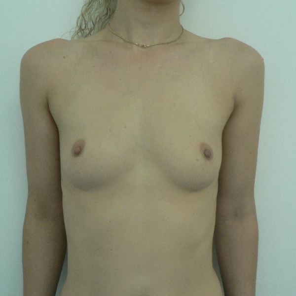 Pacienta, 20 ani, augmentare mamara bilaterala cu implante Mentor rotunde 400 cc high profile plasate subpectoral prin abord inframamar, rezultat la 5 saptamani postoperator. |