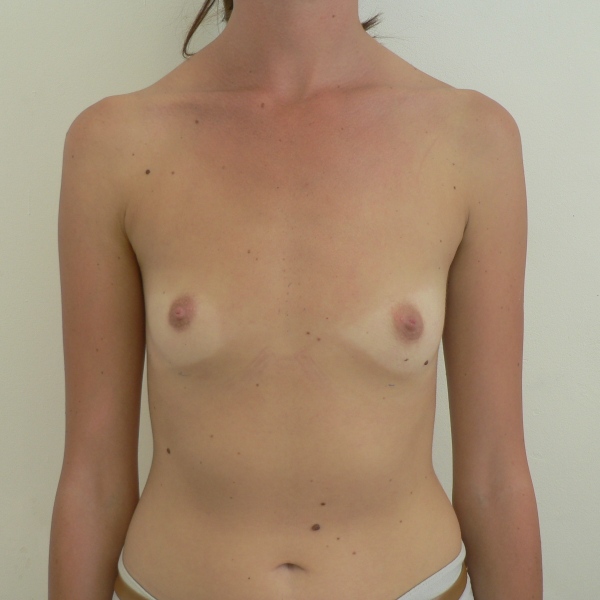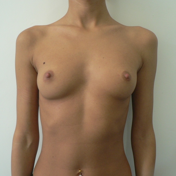 Pacienta cu importanta asimetrie toracica. Se practica augmentare mamara bilaterala cu implante Mentor anatomice 330 cc tall height full projection (dreapta) si 345 cc medium height full projection (stanga) introduse subpectoral prin abord inframamar. Dimensiunile implantelor au fost alese la cererea insistenta a pacientei. Rezultat la 5 saptamani postoperator. |