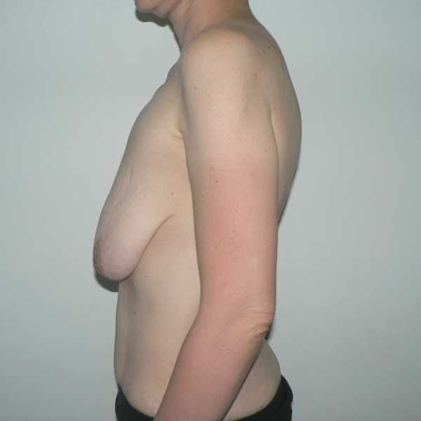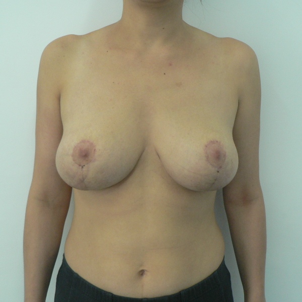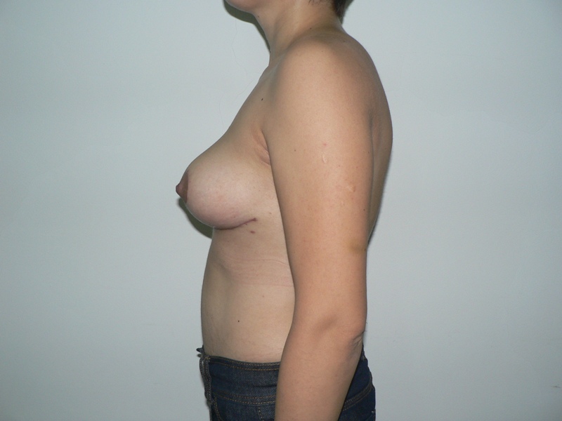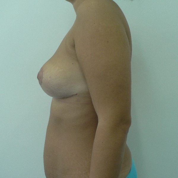 Pacienta operata in urma cu 7 ani in alt serviciu medical. Se practica mastopexie cu rearanjarea glandei , tehnica pe pedicul supero-medial si autoproteza din lambou inferior, rezultat la 1 luna postoperator.