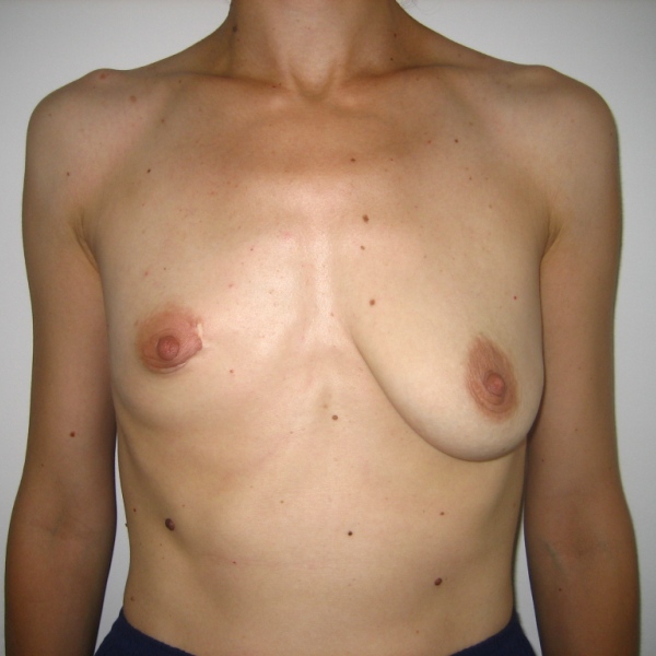 Pacienta in varsa de 24 ani, asimetrie mamara (sani drept ptozat, san stang hipotrofic). S-a efectuat augmentarea sanului stang cu proteza Arion rotunda, profil moderat 290cc si augmentarea sanului drept cu proteza Arion rotunda, profil moderat, 240cc concomitent cu ridcare cu cicatrice verticala si periareolara. Implantele au fost introduse sub muschiul pectoral.