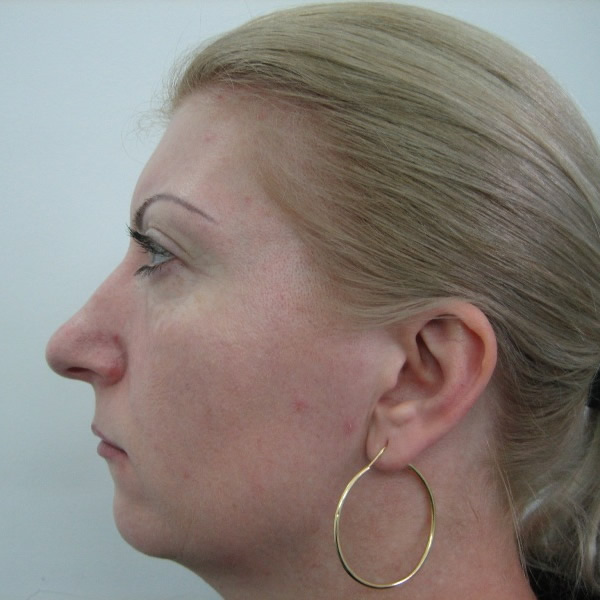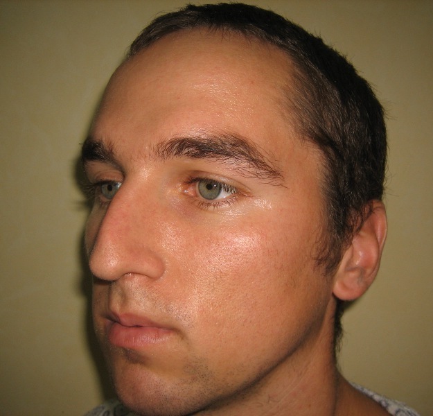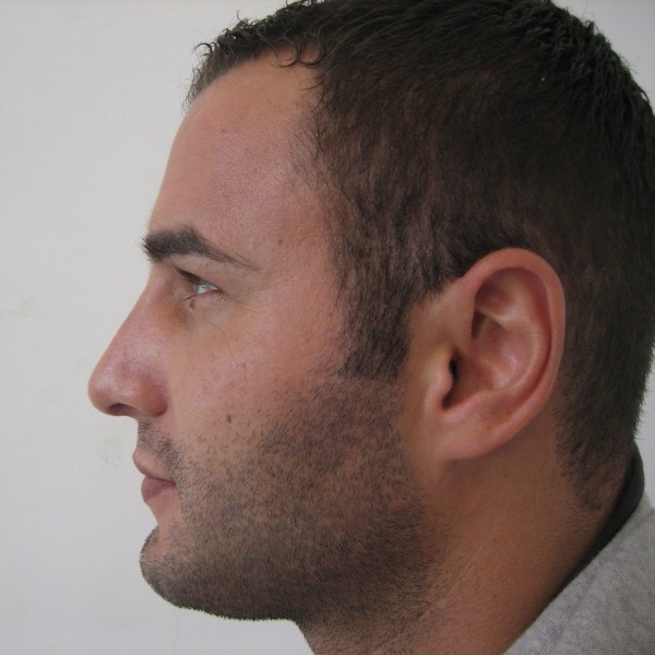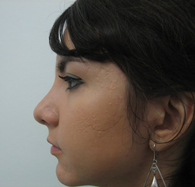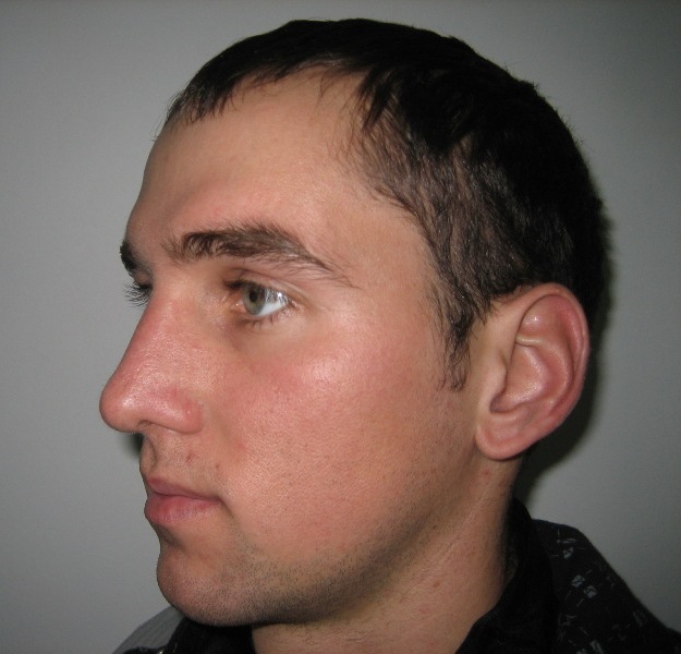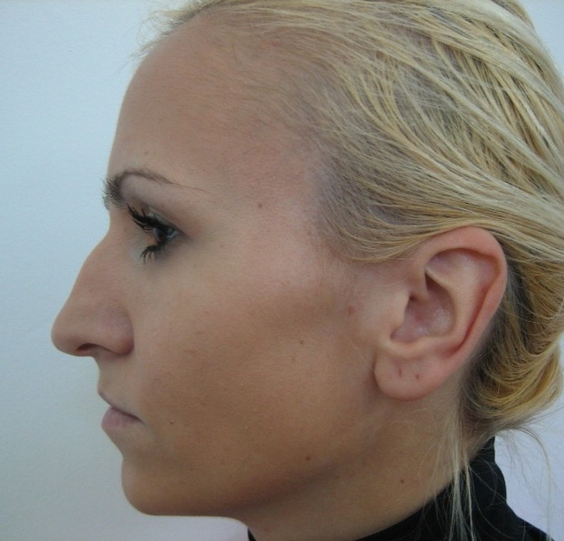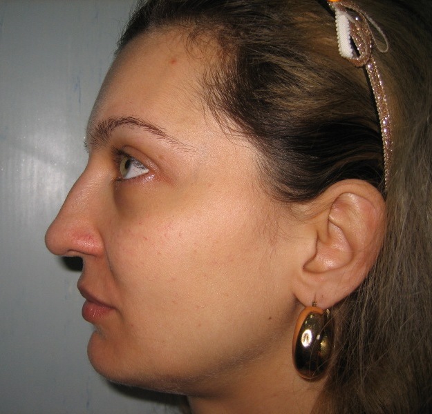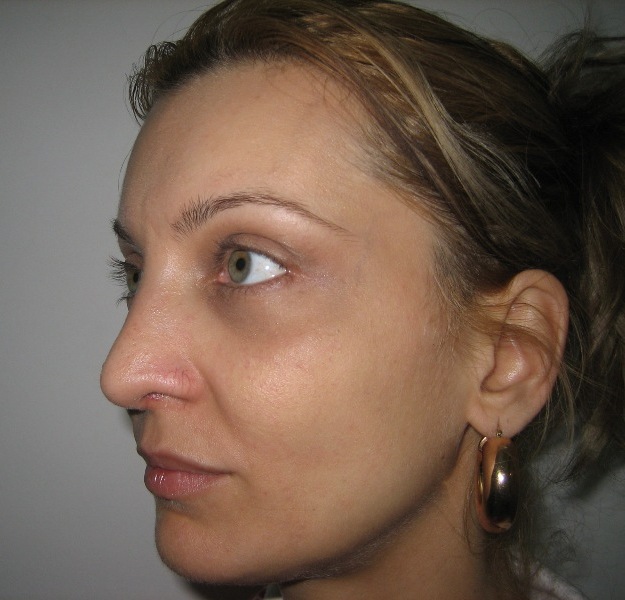 Pacient in varsta de 33 ani, rinocorectie tertiara deschisa pacientul a mai avut anterior doua rinocorectii inchise); s-a efectuat reconstructia dorsului nasului si a cartilajelor alare si triunghiulare, modificarea varfului si a columelei, utilizand multiple grefe din cartilaj costal |