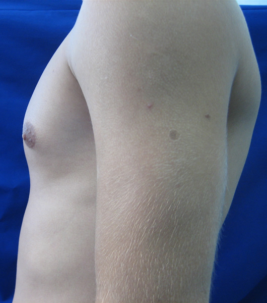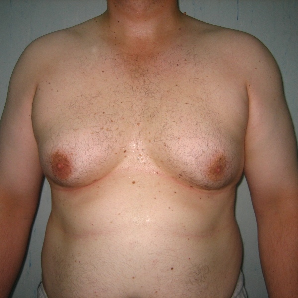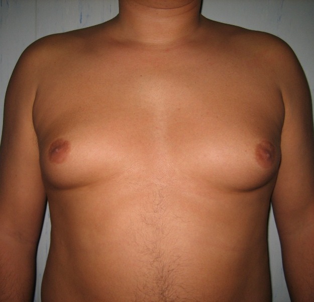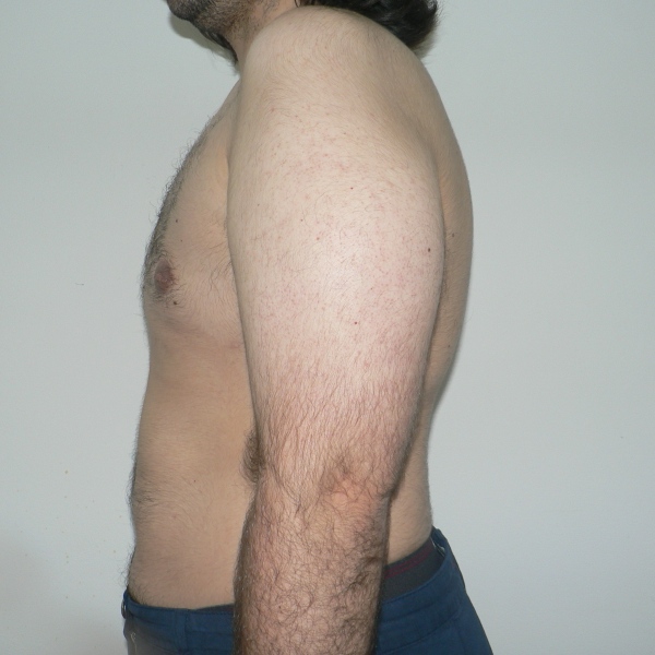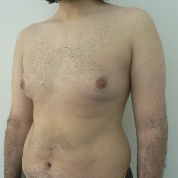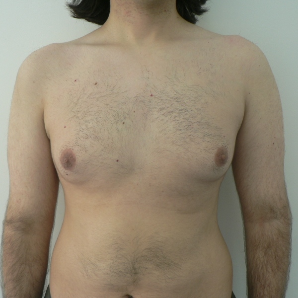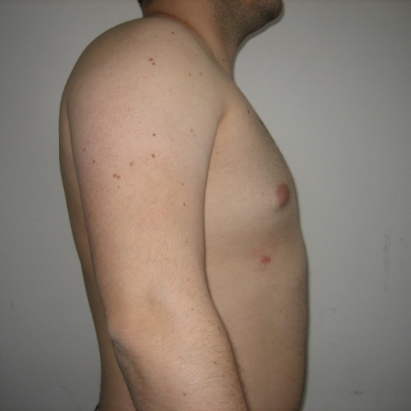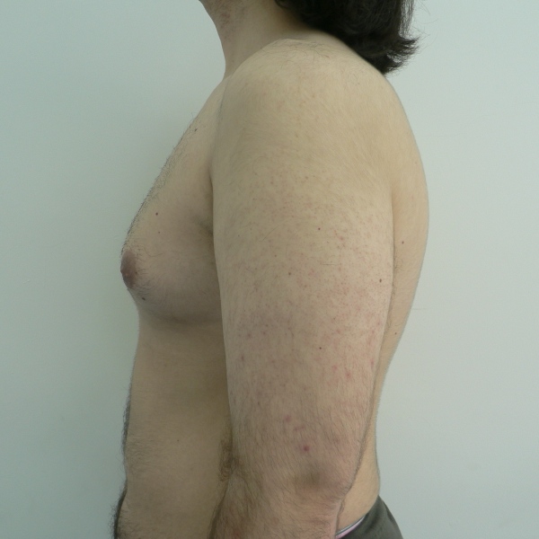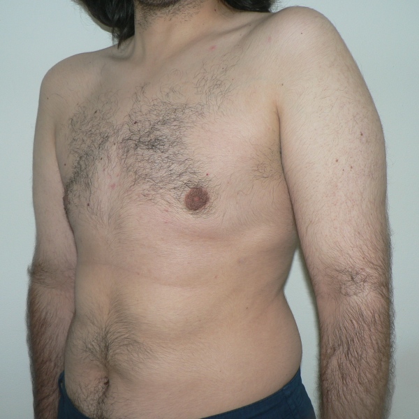 Ginecomastie bilaterala tratata cu lipoaspiratie si excizie glandulara, rezultat la 1 an postoperator. |