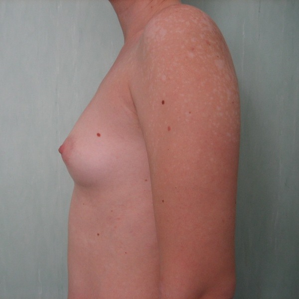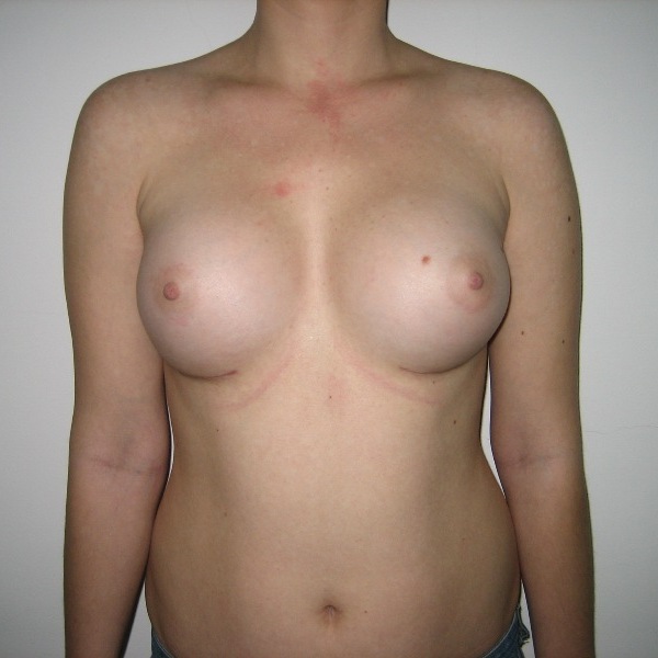 Pacienta 23 ani, augmentare cu proteze Arion rotunde texturate 350 cc profil moderat introduse subpectoral prin abord inframamar, rezultat la 14 luni postoperator. |