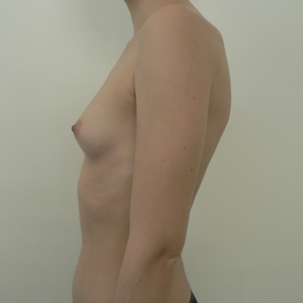 Pacienta cu importanta asimetrie toracica. Se practica augmentare mamara bilaterala cu implante Mentor anatomice 330 cc tall height full projection (dreapta) si 345 cc medium height full projection (stanga) introduse subpectoral prin abord inframamar. Dimensiunile implantelor au fost alese la cererea insistenta a pacientei. Rezultat la 5 saptamani postoperator. |