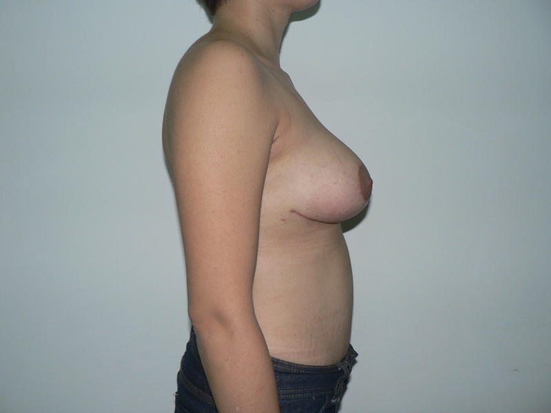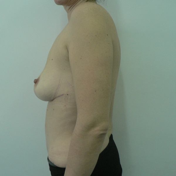 Pacienta operata in urma cu 7 ani in alt serviciu medical. Se practica mastopexie cu rearanjarea glandei , tehnica pe pedicul supero-medial si autoproteza din lambou inferior, rezultat la 1 luna postoperator.