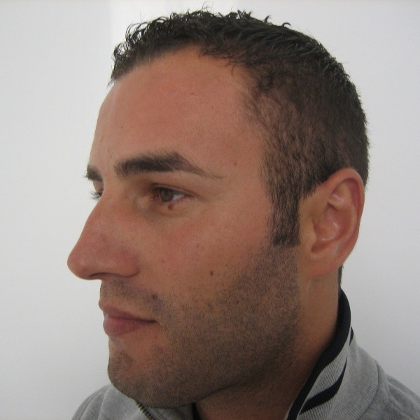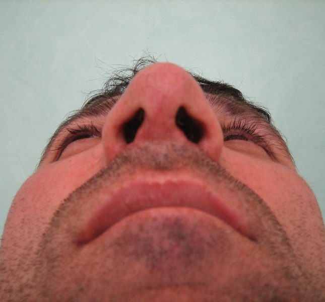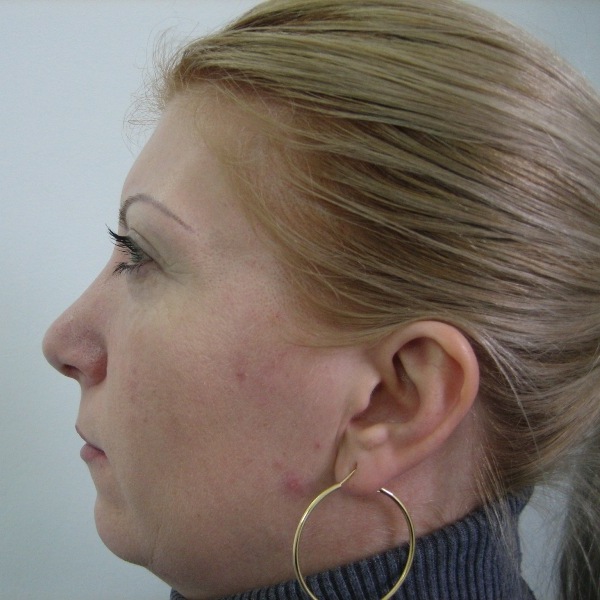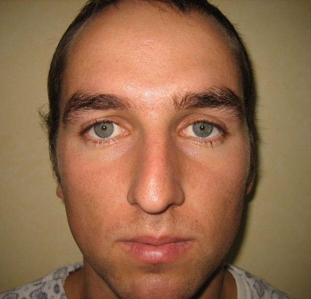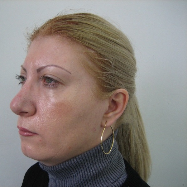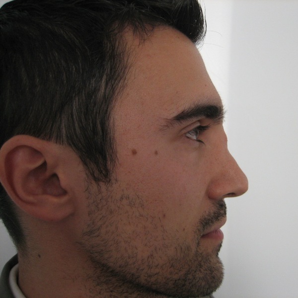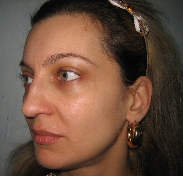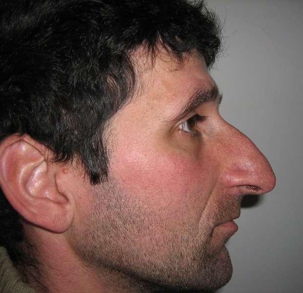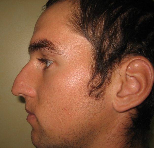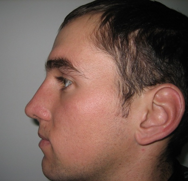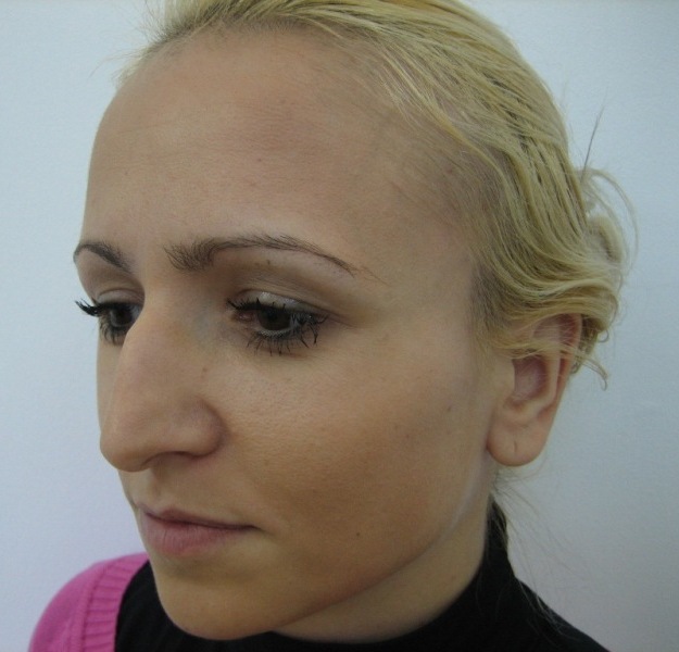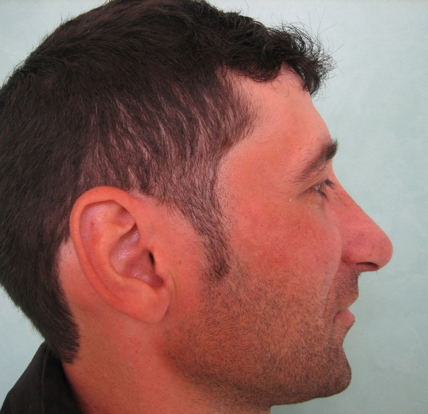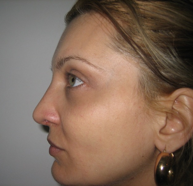 Pacient in varsta de 33 ani, rinocorectie tertiara deschisa pacientul a mai avut anterior doua rinocorectii inchise); s-a efectuat reconstructia dorsului nasului si a cartilajelor alare si triunghiulare, modificarea varfului si a columelei, utilizand multiple grefe din cartilaj costal |